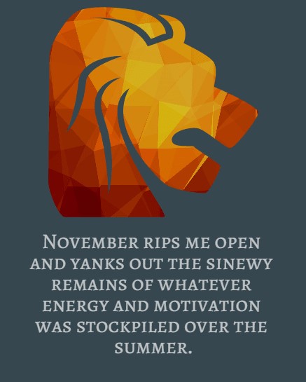 November is tough. November rips me open and yanks out the sinewy remains of whatever energy and motivation was stockpiled over the summer. Not only are there the icy claws of the election, but I’m coming off a month of my husband’s birthday, our anniversary, and Halloween launching immediately into November’s gray work, my own birthday, Thanksgiving, teacher conferences, volunteer responsibilities, and life in general. This is compounded at least for the last two years by the fact that my children seem to get sick the week before Halloween and stay sick through at least mid-January. Germs do-si-do around my house, mutating enough to get re-caught and re-shared. I am never as exhausted as I am during their sick times. All the coughing, all the sneezing, the headaches, the tired eyes.