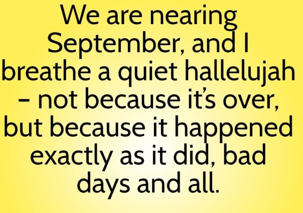 We are nearing September, and I breathe a quiet hallelujah – not because it’s over, but because it happened exactly as it did, bad days and all.