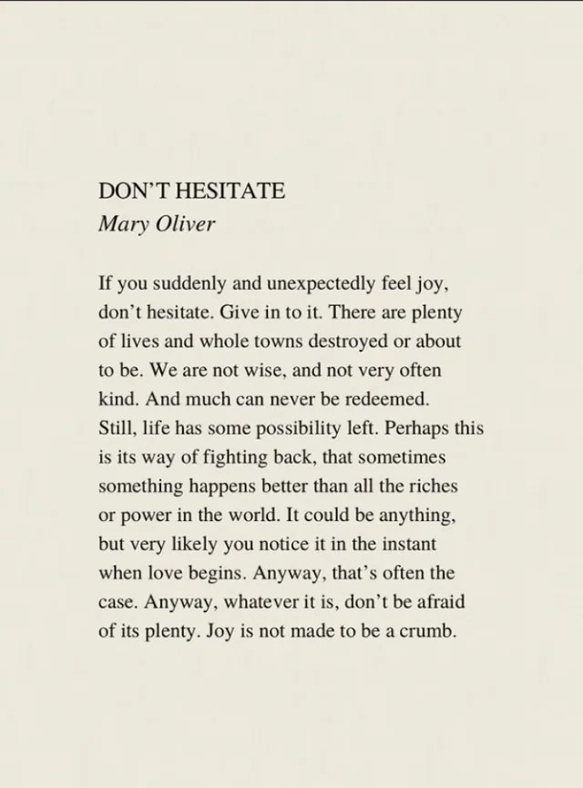 And sometimes the best you can do is offer, without reasonable transition, Mary Oliver telling us quite firmly, “Don’t Hesitate.”