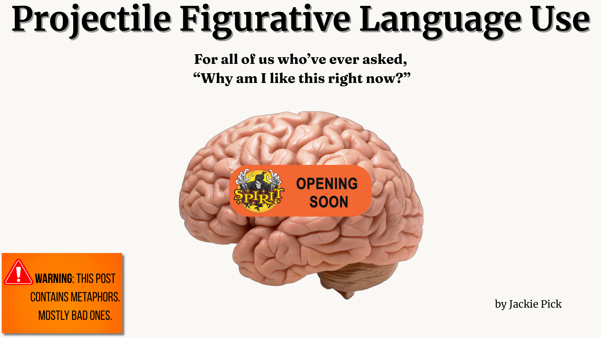 Header reads ‘Projectile Figurative Language Use’ with the subline ‘For all of us who’ve ever asked, “Why am I like this right now?”’. Centered brain image has a Spirit Halloween ‘Opening Soon’ sticker across it. Bottom-left box warns ‘This post contains metaphors. Mostly bad ones.’ Credit ‘by Jackie Pick’ appears bottom-right