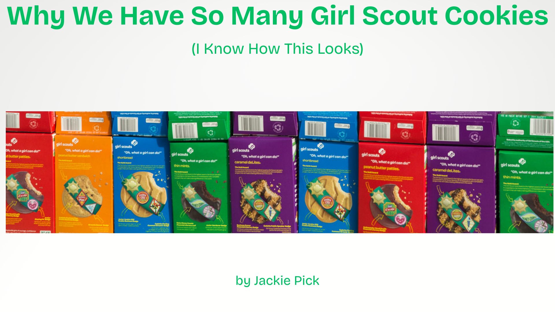 The truth is that I went to the grocery store in late winter, which is when America’s youth runs a live experiment on adult decision-making. Every year, I fail. Yes, I am weak. Yes, I love cookies. Also, I keep underestimating a group of children who have mastered capitalism.